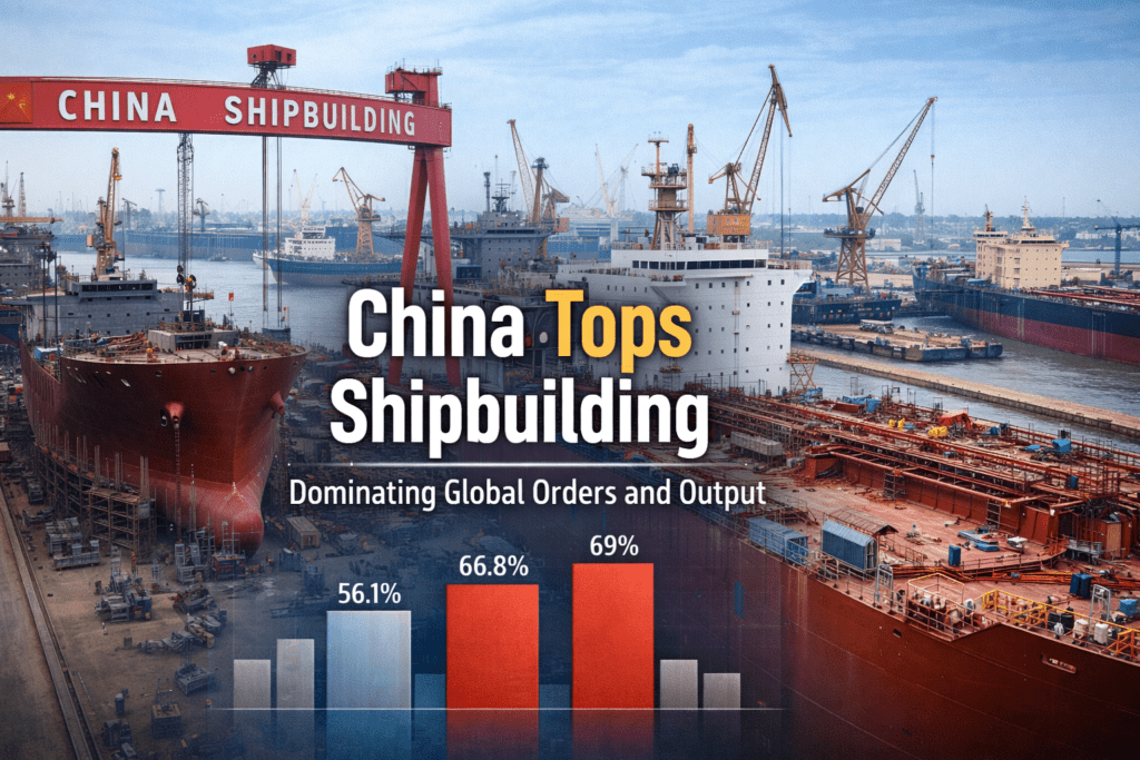China’s Total shipbuilding output reached 53.69 million deadweight tonnes (DWT) in 2025. That is an 11.4% jump compared to 2024 and accounts for 56.1% of the entire world’s shipbuilding output.