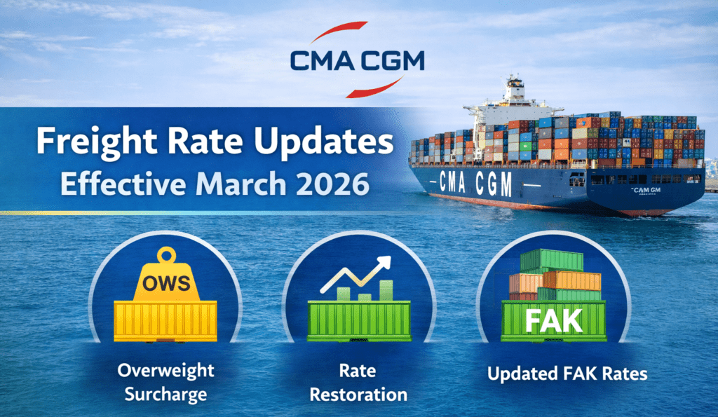 CMA CGM has informed customers of several freight rate changes taking effect throughout March 2026. The updates impact three major trade corridors, involving new overweight surcharges, rate restoration initiatives, and revised Freight All Kinds (FAK) pricing.