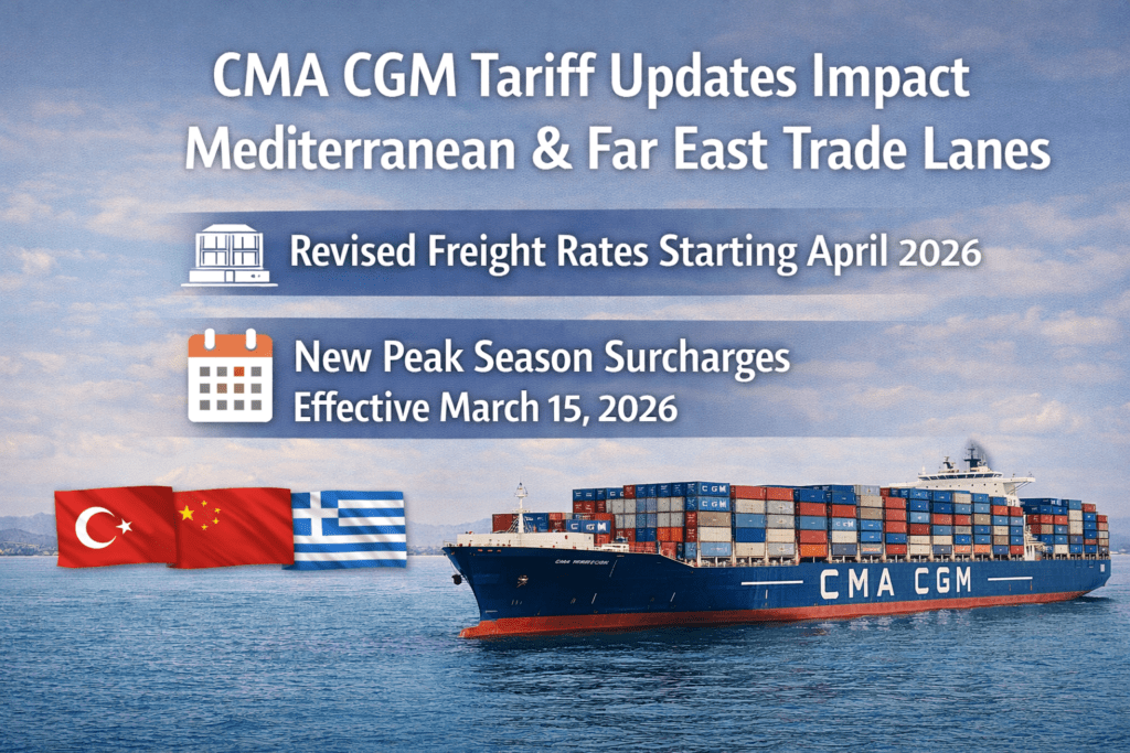 CMA CGM has issued a series of tariff updates affecting several major global trade lanes. Starting in mid-March and early April 2026, shippers will see revised Freight All Kinds (FAK) rates and new Peak Season Surcharges (PSS) applied to cargo moving out of the Mediterranean and the Far East.