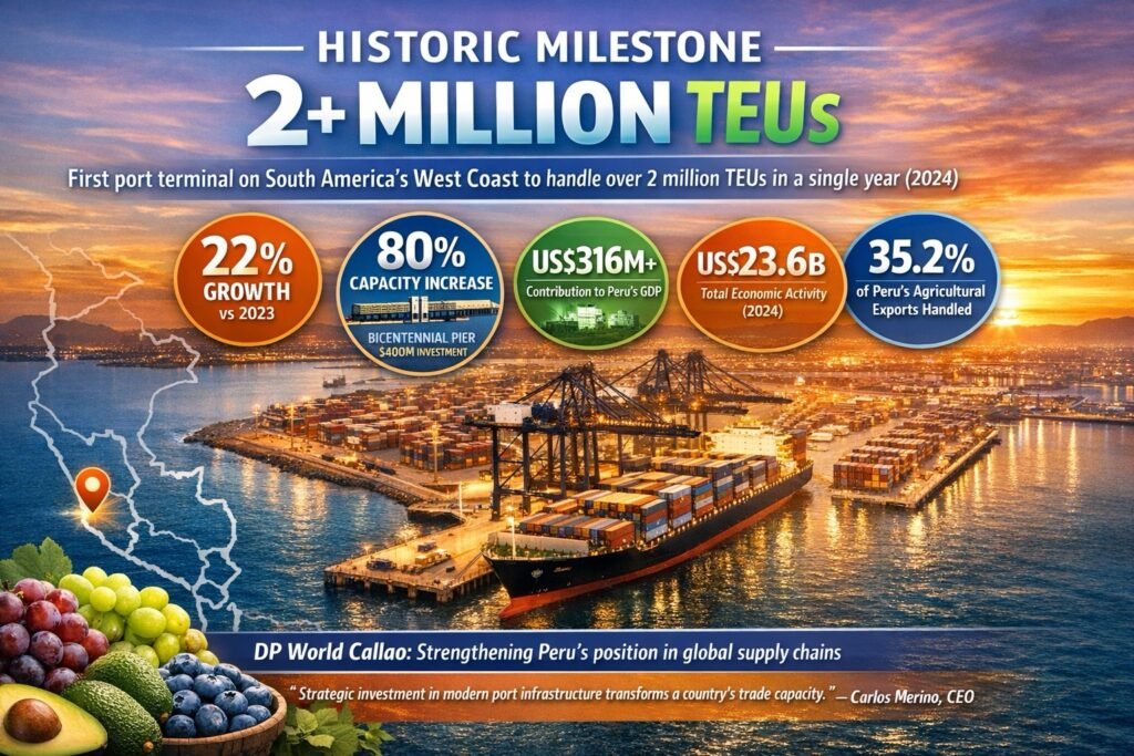 DP World has achieved a historic milestone at its port of Callao terminal, becoming the first terminal on South America’s West Coast to handle more than 2 million TEUs in a single year.