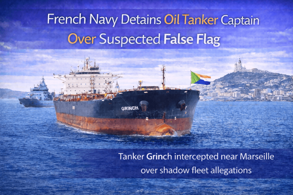 The vessel named Grinch was seized in the Mediterranean on Thursday, then diverted to anchor off the French port city, on suspicion of being part of the shadow fleet that lets Russia export oil despite sanctions.