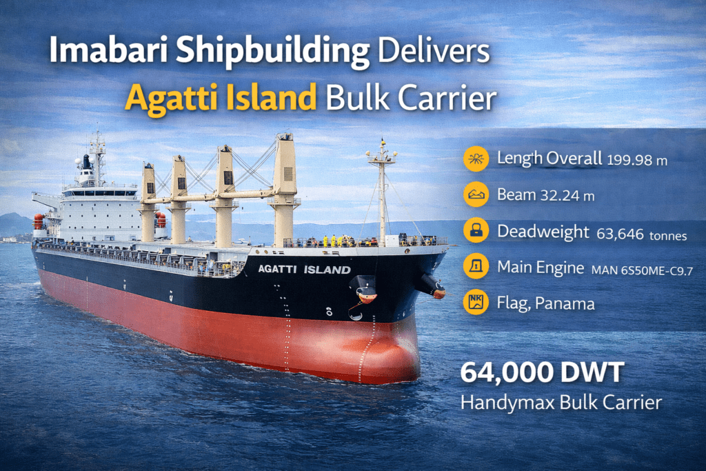 Imabari Shipbuilding has officially delivered the Agatti Island, a 64,000 dwt bulk carrier. The team completed the vessel at their Imabari Shipyard and handed it over on January 27, 2026.