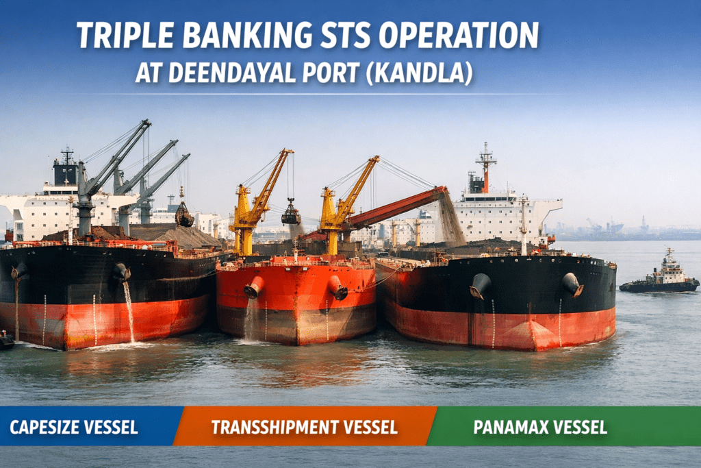 Deendayal Port Authority (Kandla) has successfully completed a highly complex triple banking Ship to Ship (STS) operation. This marks the first time such an intricate maritime cargo transfer has been executed at a high tidal port in India.