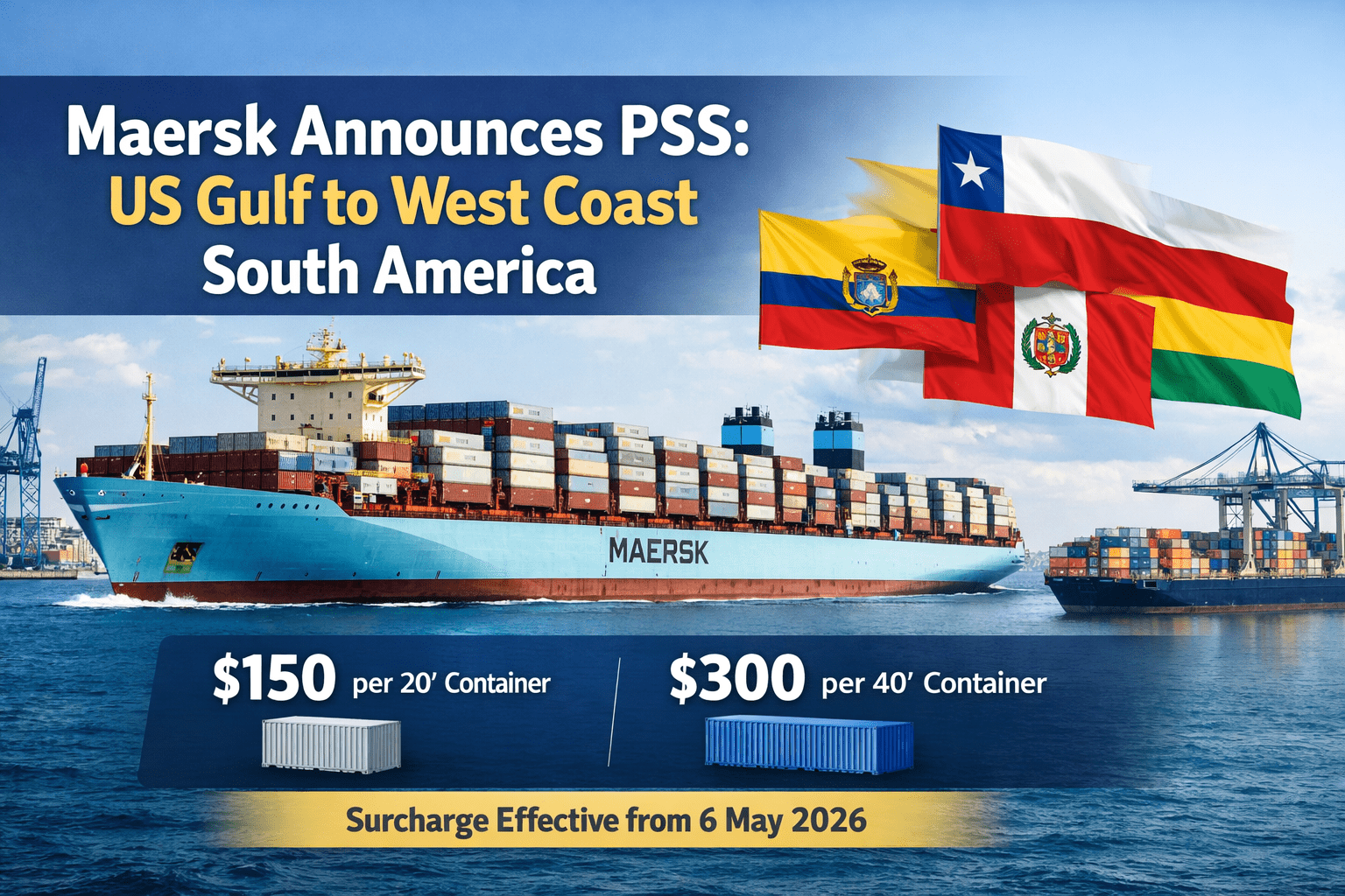 Maersk has introduced PSS for US Gulf to the West Coast of South America, effective from 6 May 2026 until further notice.