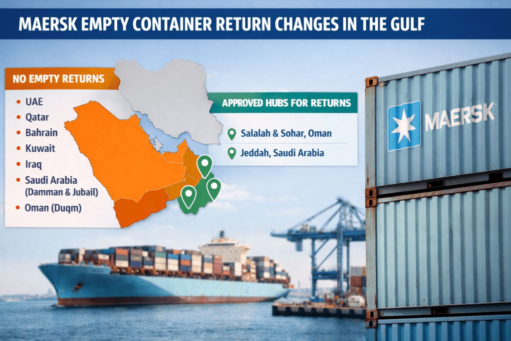 Maersk has temporarily changed its empty container return procedures for several Gulf countries. Driven by the rapidly evolving security situation and uncertain operational conditions around the Strait of Hormuz, the carrier implemented this measure to protect its vessels, crews, and customers’ cargo.