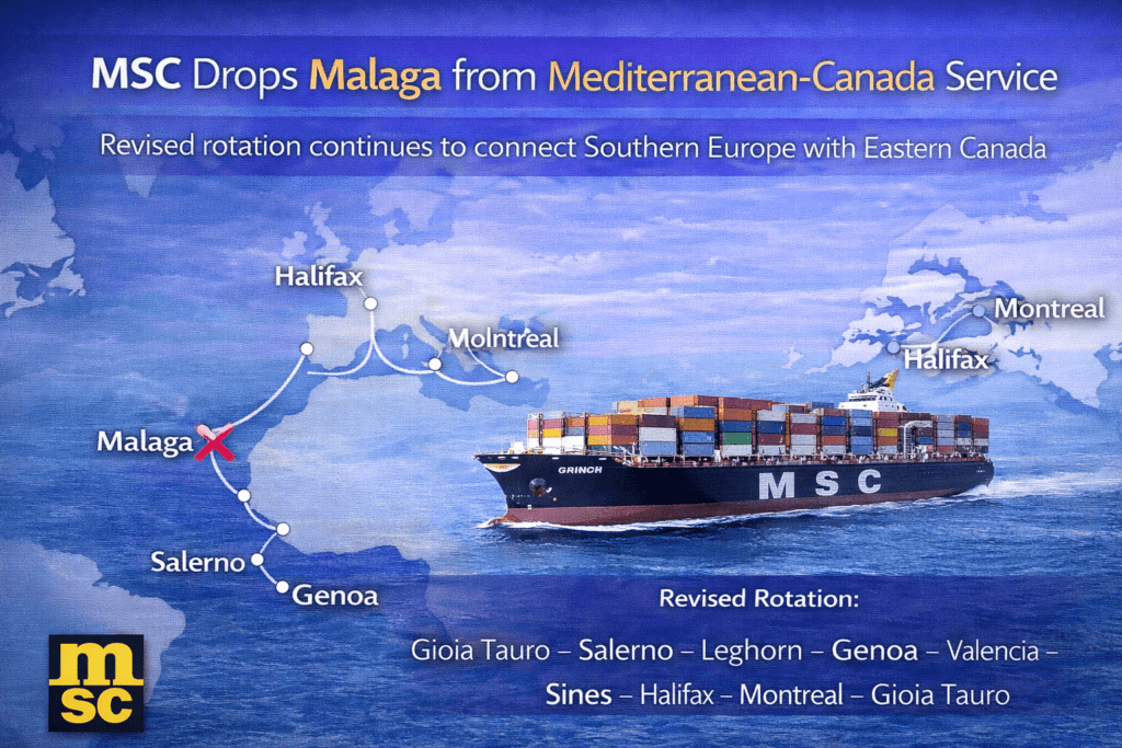 The change reflects an update to MSC’s port coverage on the Mediterranean–Canada trade, with the service continuing to link Southern Europe with Eastern Canada via the St. Lawrence Seaway.