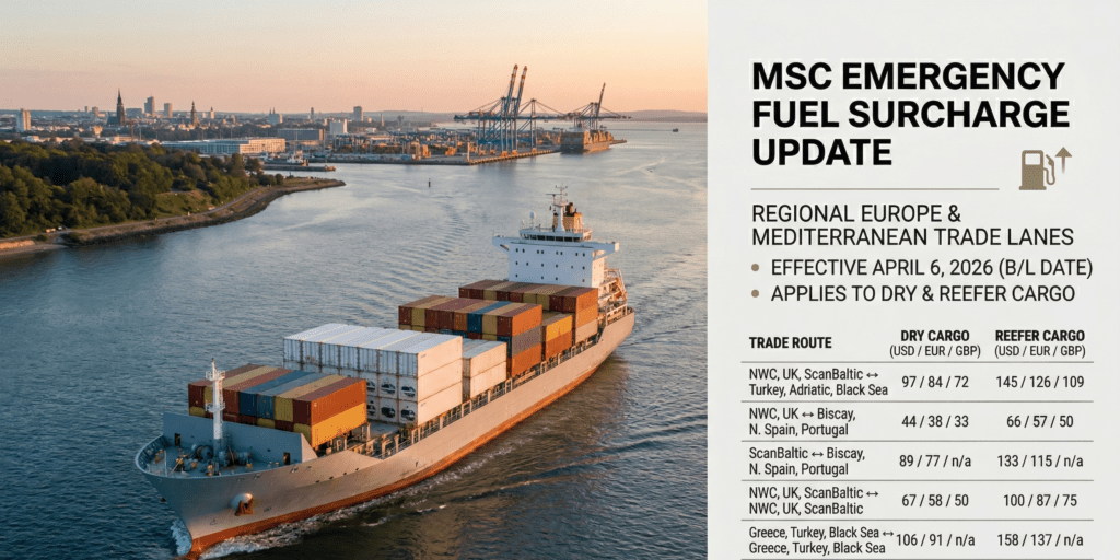 MSC has officially updated its Emergency Fuel Surcharge (EFS) for multiple short sea and regional trade lanes. The revised surcharge impacts routes connecting Northern Europe (including the UK and ScanBaltic regions), the North East Mediterranean, and the Black Sea.