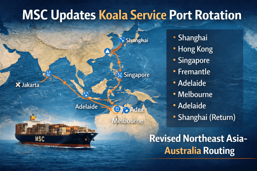 Mediterranean Shipping Company (MSC) has officially updated the port rotation of its Northeast Asia to Australia Koala service. The ocean carrier implemented these schedule changes to improve overall network connectivity and operational efficiency across the region.