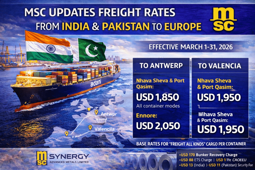 MSC has released its updated freight rates for container shipments moving from India and Pakistan to Europe. The revised pricing takes effect from March 1, 2026, through March 31, 2026, impacting major origin ports including Nhava Sheva, Ennore, Kolkata, and Port Qasim.