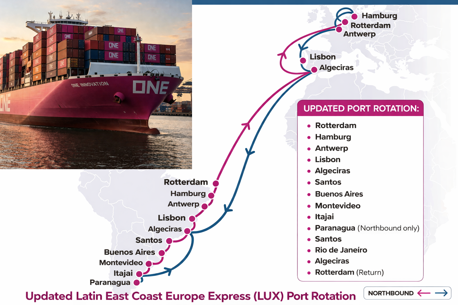 Ocean Network Express (ONE) has announced an upcoming adjustment to the port rotation of its Latin East Coast Europe Express (LUX) service. To enhance schedule reliability and strengthen overall network offerings, the carrier is officially removing Felixstowe and southbound calls at Paranagua from the loop.