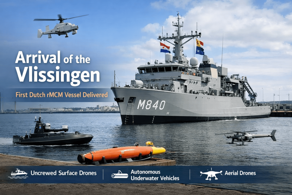 The Royal Netherlands Navy officially took delivery of the Vlissingen in Den Helder. This is the first mine countermeasure vessel the Netherlands has received under the replacement Mine CounterMeasure (rMCM) program, following Belgium’s initial delivery in November 2025.