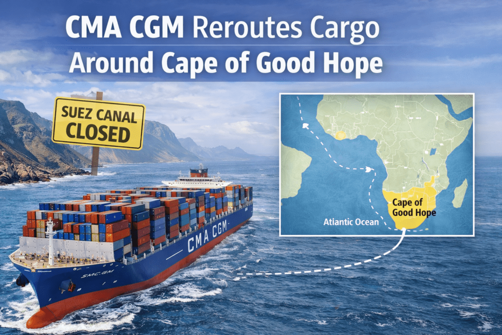 French container shipping company CMA CGM has announced it will reroute vessels on three of its services via the Cape of Good Hope, citing a “complex and uncertain international context.”