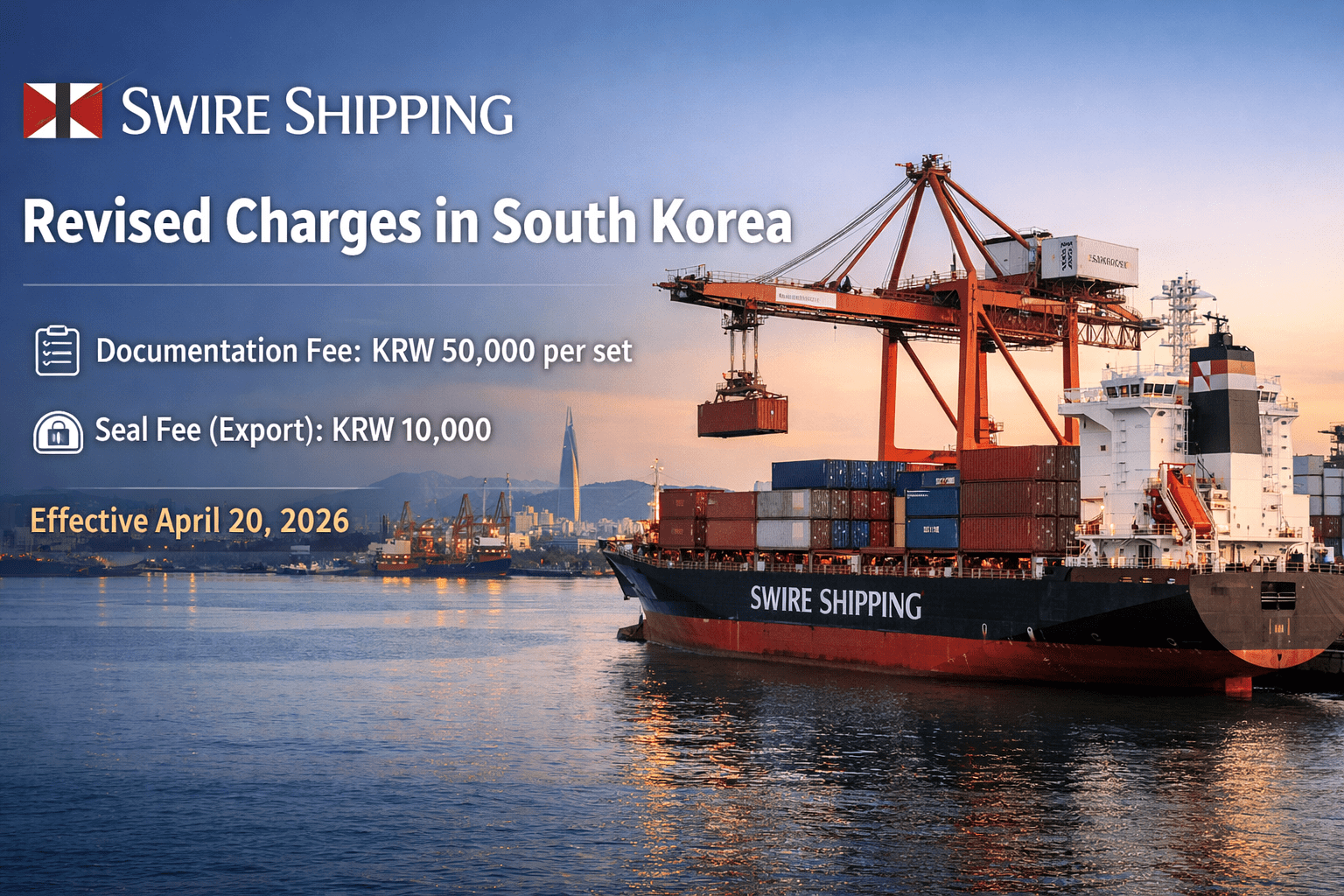 Swire Shipping has announced an upcoming revision to its local charges in South Korea. Following a recent review of service related costs, the carrier is adjusting its fee structure to better align operational expenses with its service provision.