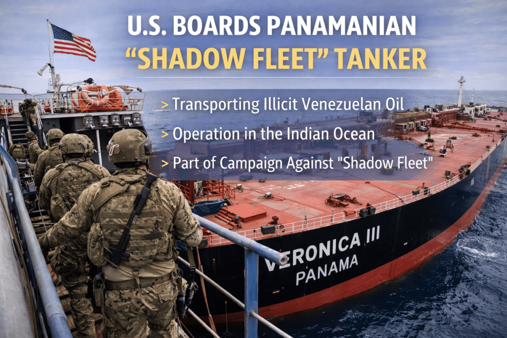 United States forces have boarded the Panama-flagged oil tanker Veronica III (IMO: 9326055) in the Indian Ocean. This operation marks the ninth vessel interdicted in an intensifying campaign against the “shadow fleet” transporting illicit Venezuelan oil.